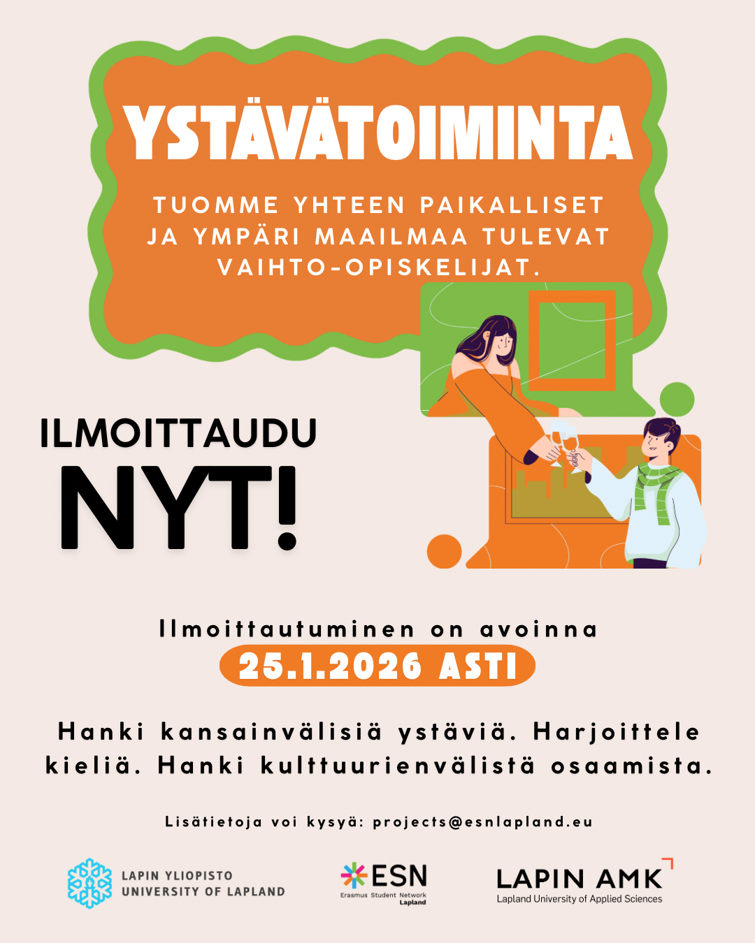 Kansainvälinen ystävätoiminta on ESN Laplandin, Lapin yliopiston ja Lapin ammattikorkeakoulun yhteistyössä järjestämä projekti, jonka avulla tuodaan Rovaniemelle saapuvat kansainväliset opiskelijat yhteen paikallisten kanssa. Haluamme edistää kulttuurivaihtoa ja tutustuttaa kansainvälisiä opiskelijoita suomalaiseen kulttuuriin.